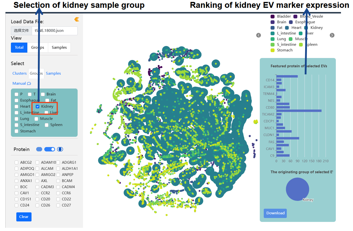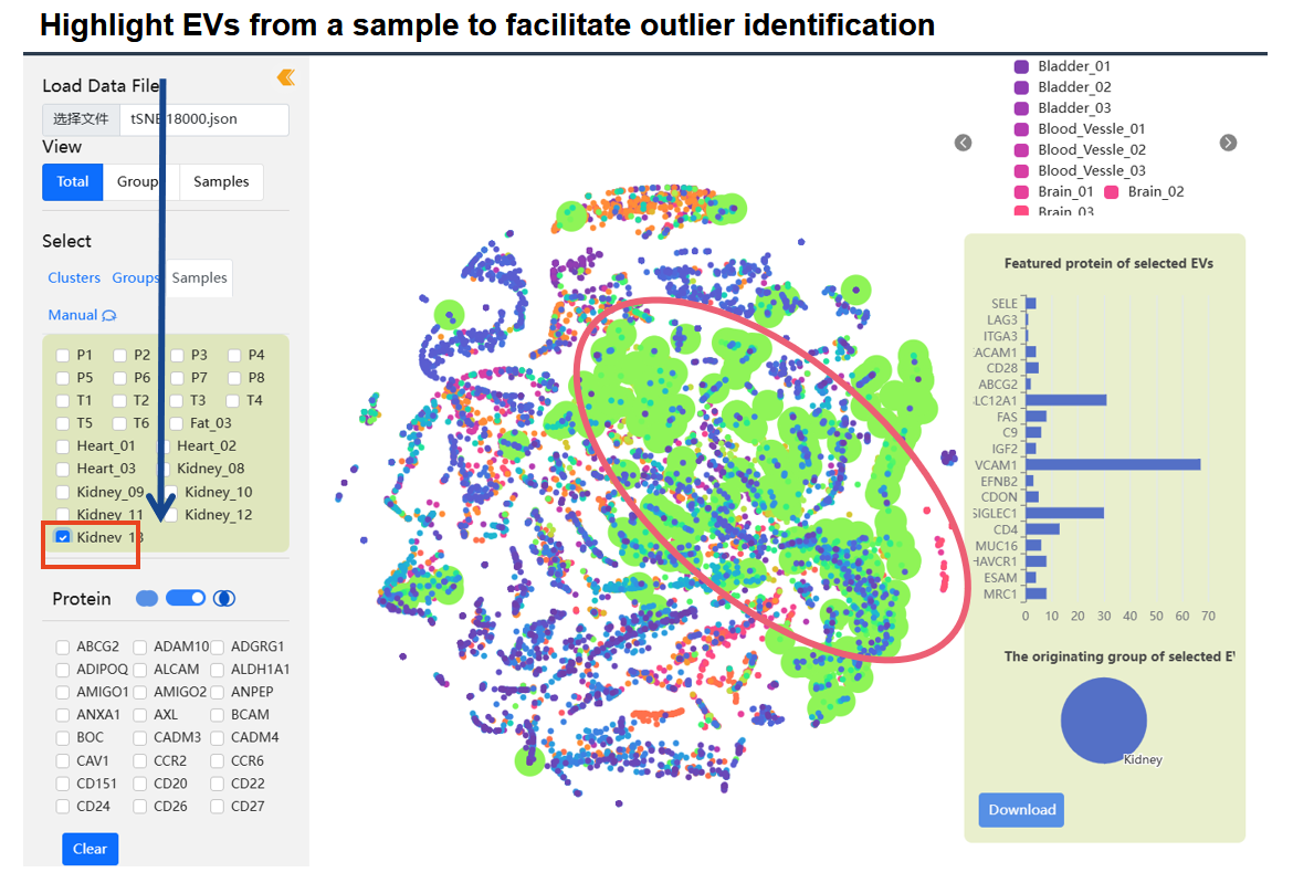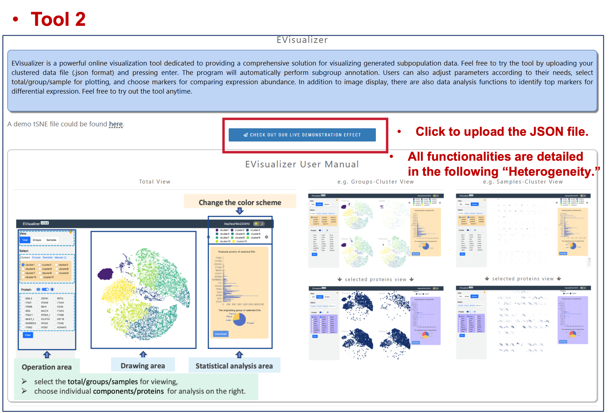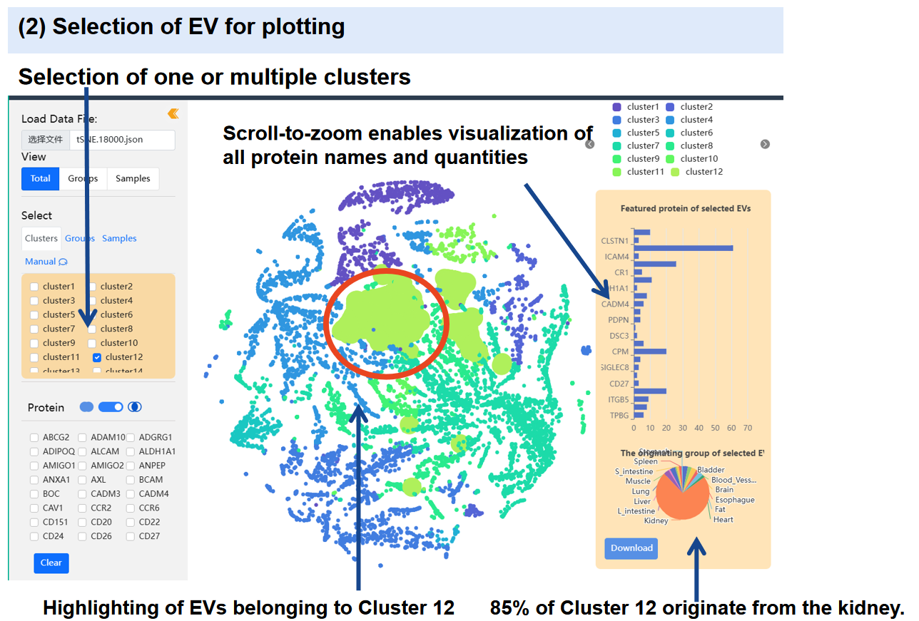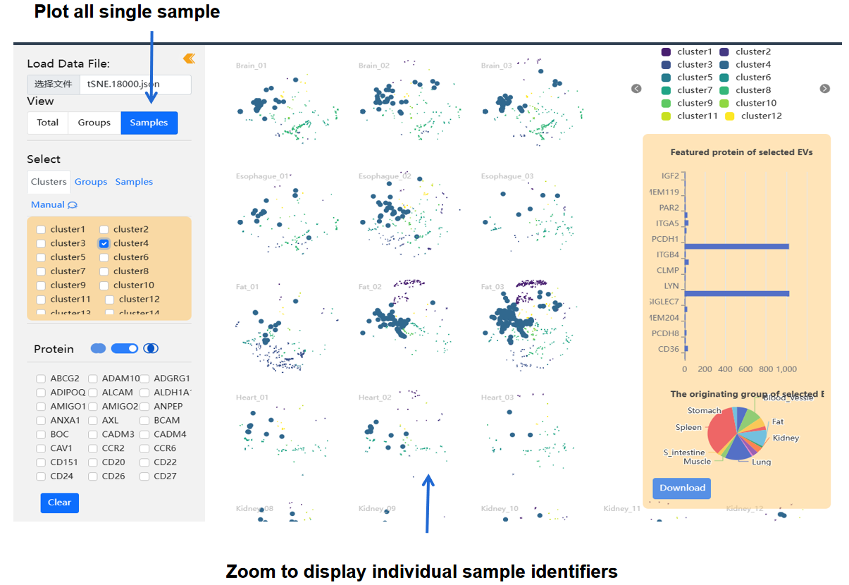(2) EVisualizer, an interactive visualization platform, explores selected EV subgroups or markers across samples using clustering results. Users can load the JSON file from the first tool or upload their own JSON file. The tool supports arbitrary combination and comparison of clusters and markers across multiple views and enables users to delineate custom subpopulations.
