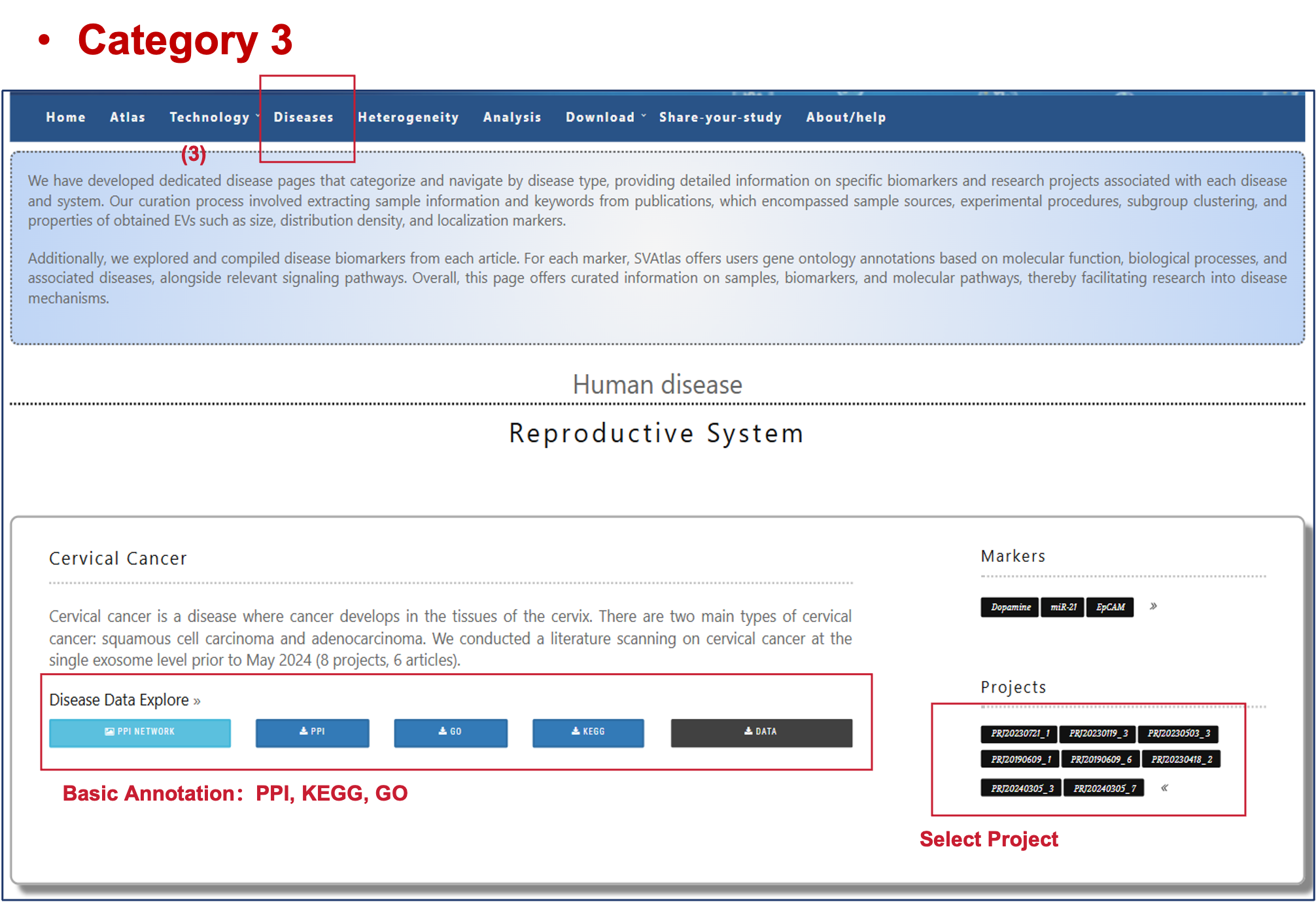 (3) Alternatively, navigate to the Disease page, view detailed annotations associated with relevant disease datasets.