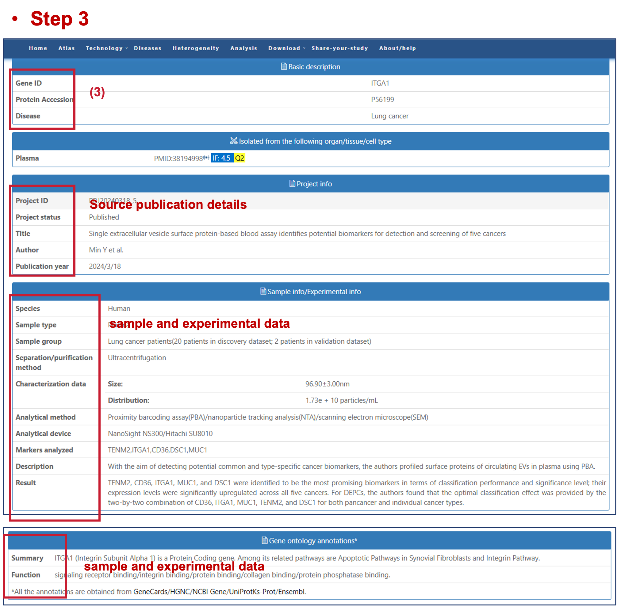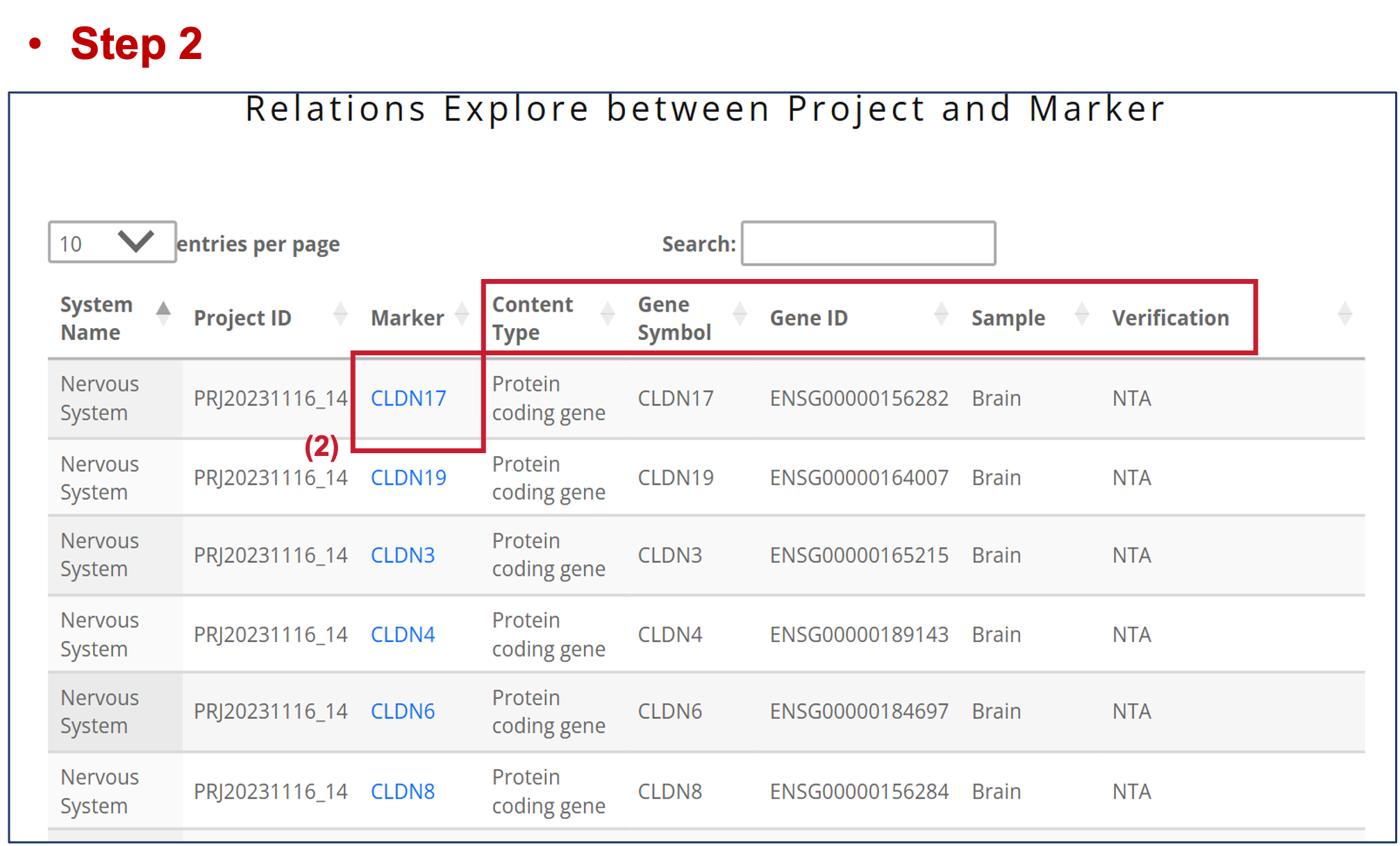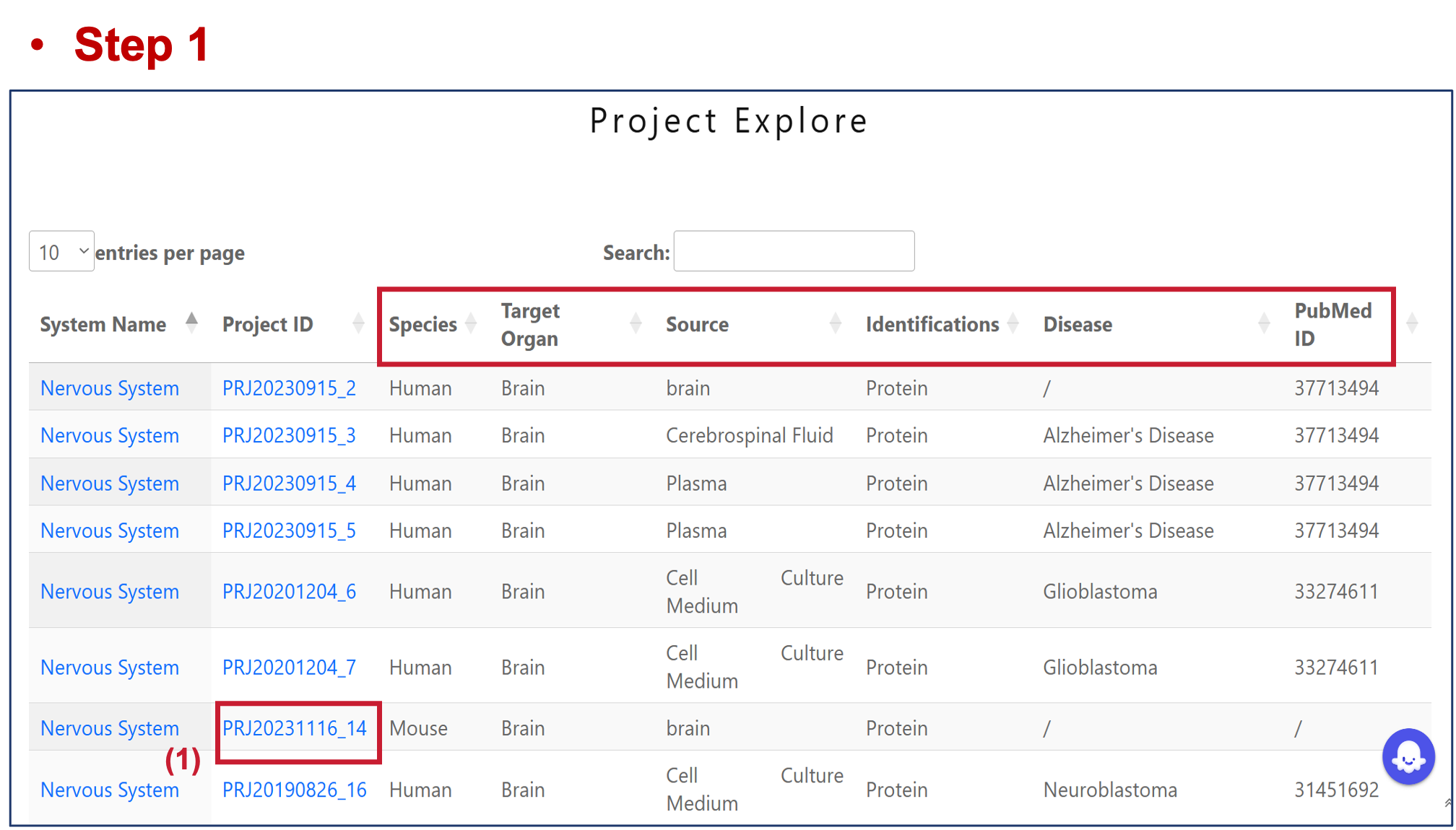 (1) The page includes sample origin, target organ, associated diseases, marker types, and PubMed ID. Click on the Project ID to access details.