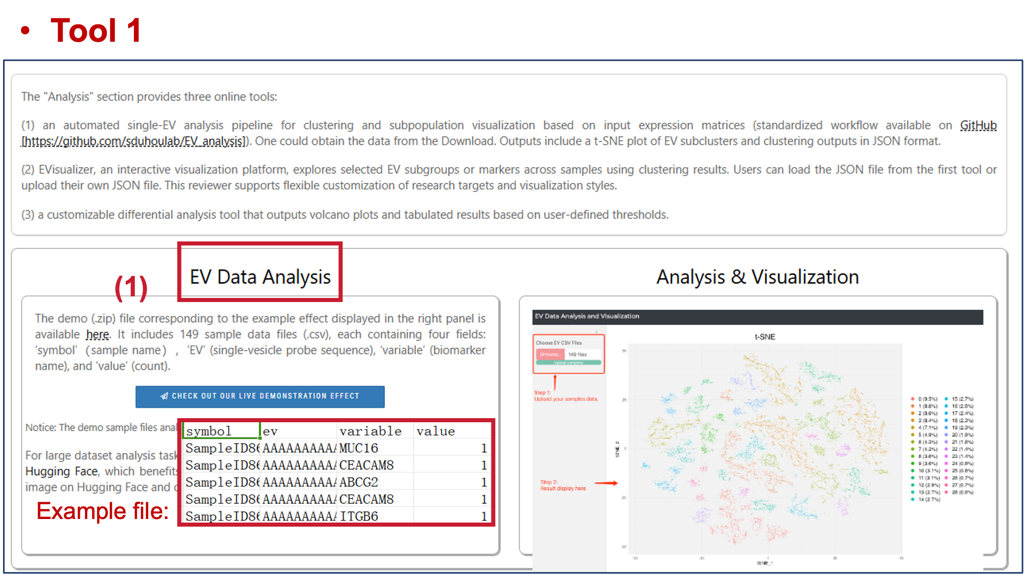 (1) This pipeline implements an automated single-EV analysis for clustering and subpopulation visualization from input expression matrices. It enforces a four-column upload format and automatically optimizes the number of principal components based on dimensionality-reduction results. Outputs comprise a t-SNE visualization of EV subclusters and clustering metadata exported in JSON format.