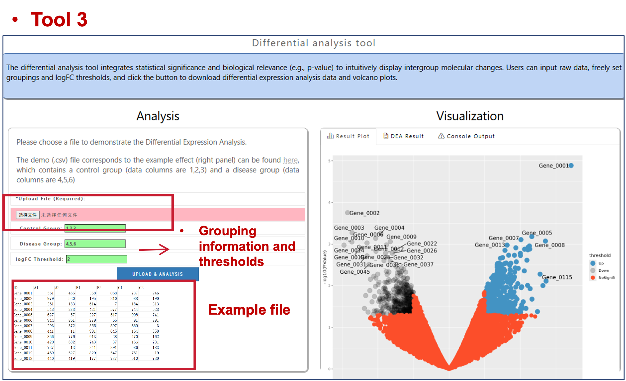 (3) a customizable differential analysis tool that outputs volcano plots and tabulated results based on user-defined thresholds.